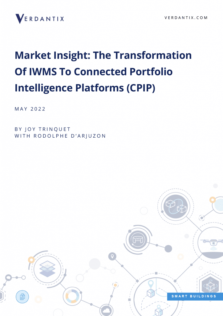 Verdantix Market Insight The Transformation of IWMS to Connected Portfolio Intelligence Platforms (CPIP) Laden Sie Ihren kostenlosen Bericht herunter Verwandter Inhalt Smart Buildings, Smart Futures: WiredScore Guide to Delivering Value With Smart Technology November 20, 2023 Forschung & Einblicke Mehr erfahren Checkliste für die Auswahl eines Buchungssystems für Arbeitsplätze September 25, 2023 Forschung & Einblicke Mehr erfahren Gartner® Hype Cycle für hybride Arbeit 2023 August 10, 2023 Forschung & Einblicke Mehr erfahren