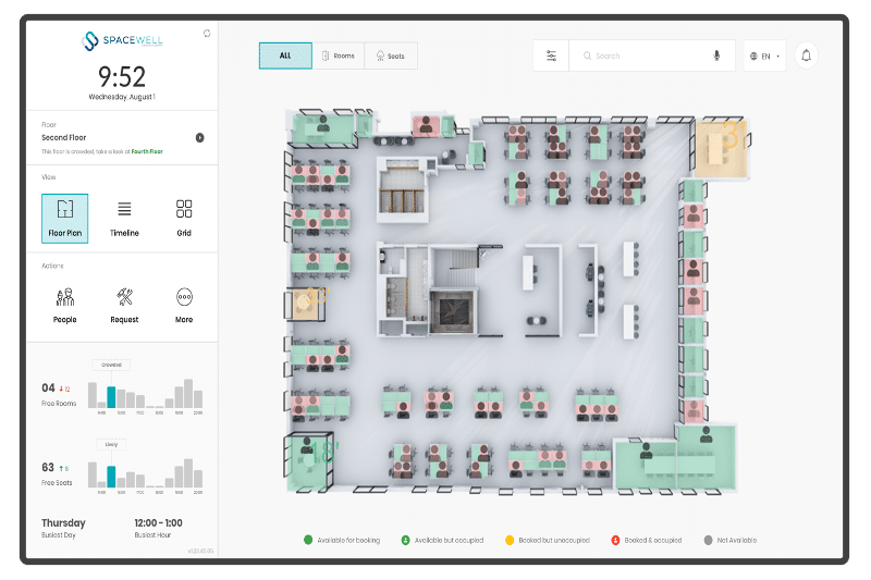 Get a real-time view of the use of the workplace on our large-screen interactive kiosk. The kiosk shows all floors and recommends suitable spaces based on crowdedness. You can book rooms, seats and other services directly from the screen. The occupancy and comfort levels of the rooms are shown in real-time.